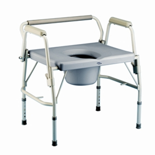 The Invacare Bariatric drop arm commode has extra wide and deep seat surface with the added convenience of being able to drop the arms for side transfers.