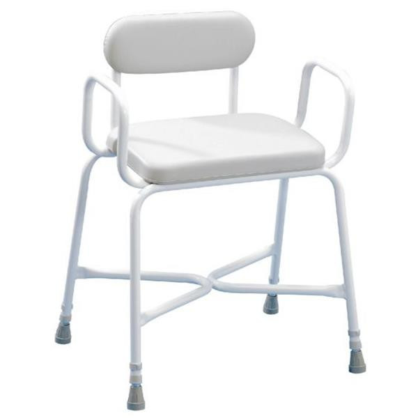 The Homecraft Sherwood Plus Bariatric Shower Stool, with Arms and Padded Seat/Back consists of a 2.5cm steel frame, with a heavily padded vinyl covered seat. The adjustable depth back rest adjusts from 5 - 17.7cm behind the seat. The seat padding is 2.5 - 3.8cm thick.