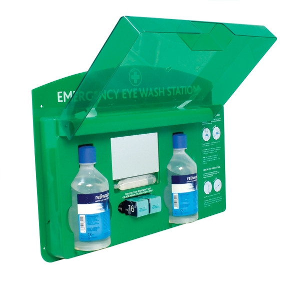 - Holds 2 x 500mL sterile saline solution eye wash bottles, eye wash pods and eye pad dressings.