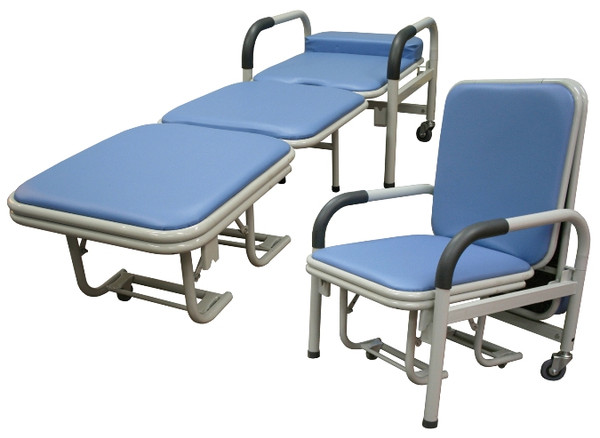 Chair, metal frame with armrests, lay flat capabilities for use as a bed.